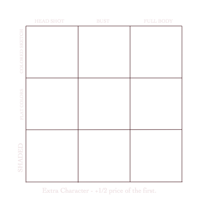 Please have a clear reference or image of the character(s) you wish to have drawn. Ref Sheets are preferred, but an unshaded image will be accepted. For best and most accurate design portrayal, please send images via email.Please list any emotions, poses or themes you would like displayed in your commission. | Please also state the type of commission you are wanting; Tid-Bit, Fullbody, flatcolors or full backgrounds etc. This helps accurately price your commission. NOTE: complex characters, items, and clothing will change the price of the commission.If you are purchasing a reference commission you MUST have an image of the character who's ref I'm making ready. (Original adopt images/ concept sketches etc.) I will NOT design the character and make the reference unless also being commissioned for a design.