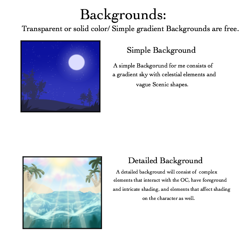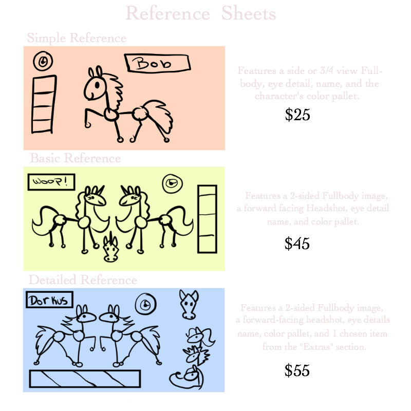 Please have a clear reference or image of the character(s) you wish to have drawn. Ref Sheets are preferred, but an unshaded image will be accepted. For best and most accurate design portrayal, please send images via email.Please list any emotions, poses or themes you would like displayed in your commission. | Please also state the type of commission you are wanting; Tid-Bit, Fullbody, flatcolors or full backgrounds etc. This helps accurately price your commission. NOTE: complex characters, items, and clothing will change the price of the commission.If you are purchasing a reference commission you MUST have an image of the character who's ref I'm making ready. (Original adopt images/ concept sketches etc.) I will NOT design the character and make the reference unless also being commissioned for a design.